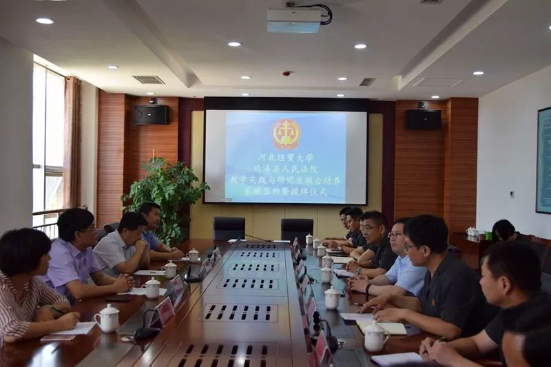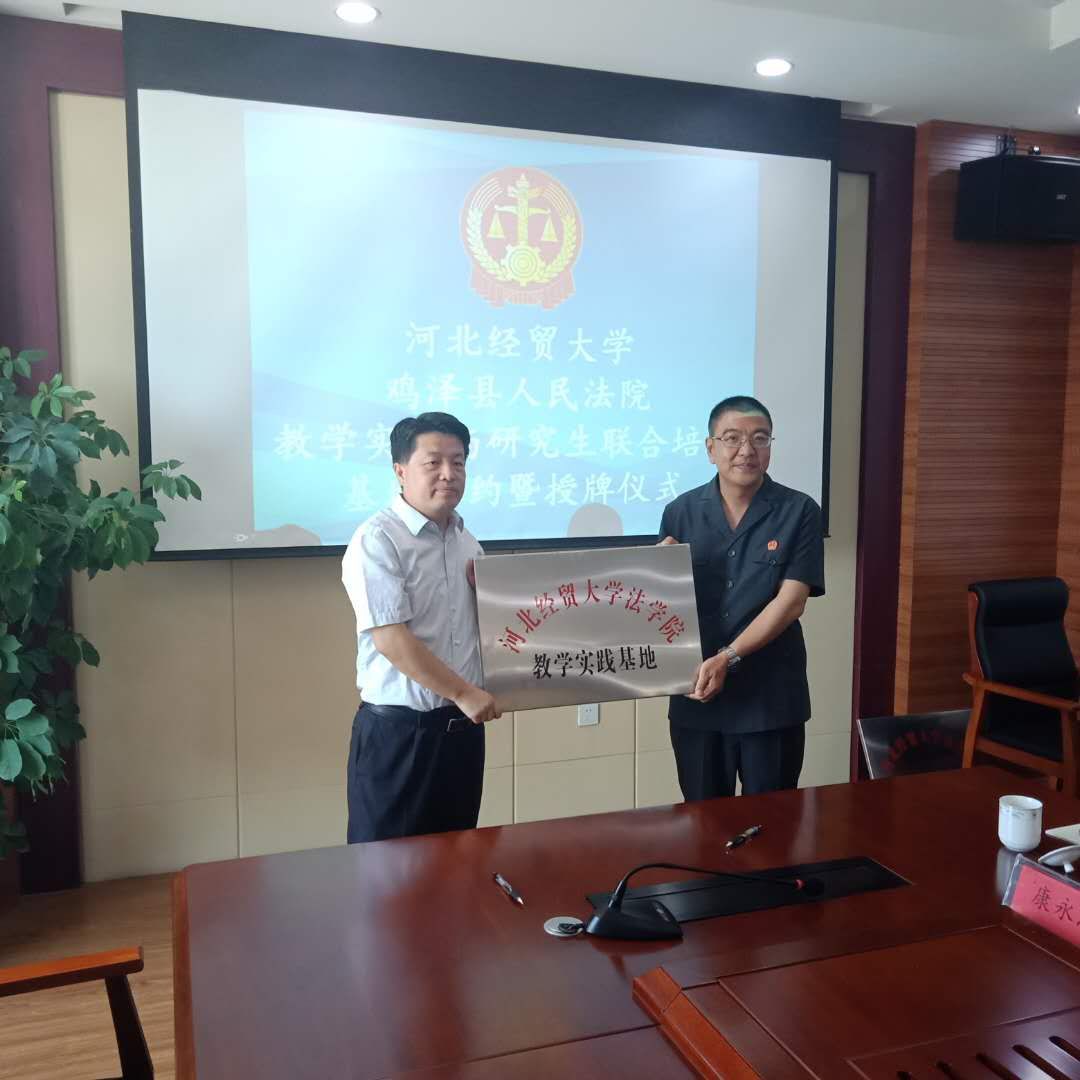 5月29 日上午,公司与鸡泽县人民法院联合举办共建“教学实践与研究生联合培养基地”签约授牌仪式暨座谈活动。公司党委书记武玉鹏、经理王利军、硕士生导师、教授张亚军、副教授张永进;鸡泽县委常委、政法委书记、群工部部长刘志强;鸡泽suncitygroup太阳集团党组全体成员及干警代表出席签约仪式。