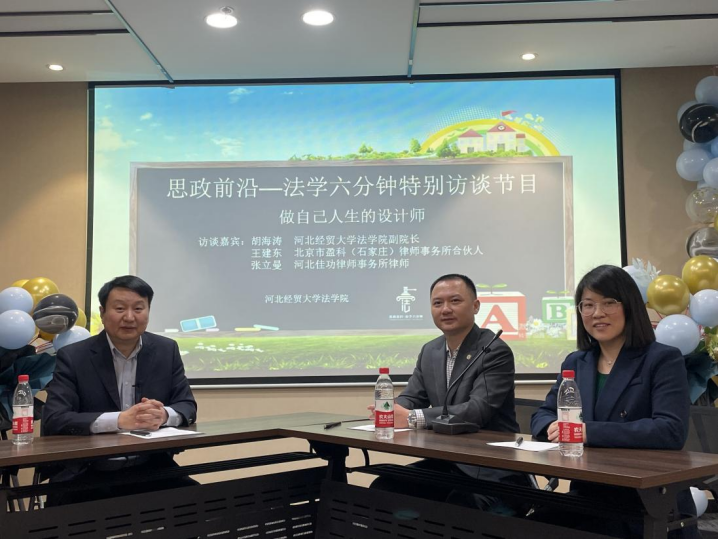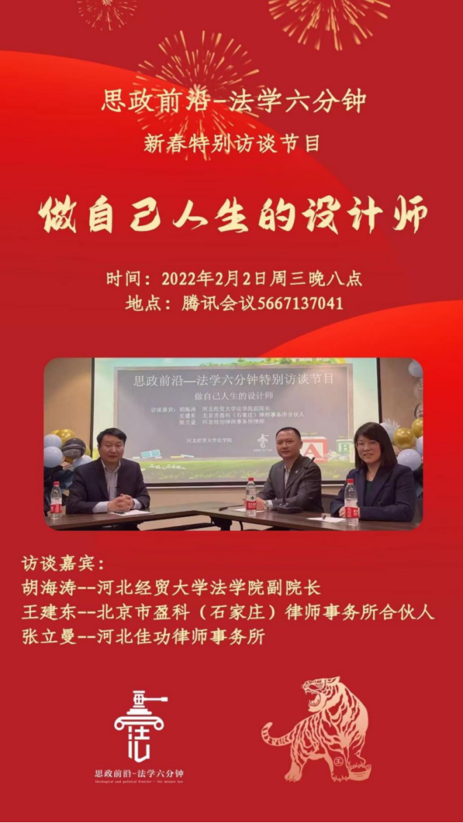 本期为同学们带来的是法学六分钟的特别节目——做自己人生的设计师。作为首次特别栏目,我们有幸邀请到了北京盈科(石家庄)律师事务所的合伙人王建东律师,以及河北佳功律师事务所的张立曼律师,并由suncitygroup太阳集团副经理胡海涛老师作为本次活动的主持人,与嘉宾进行访谈交流。