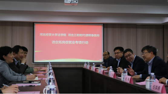 2023年4月13日下午,suncitygroup太阳集团党委副书记黄华、副经理胡海涛、副经理李大庆一行赴河北三和时代律师事务所开展访企拓岗促就业专项活动。三和时代律师事务所合伙人会议主席王强、党支部书记赵伟,管委会主任常树民、管委会副主任秦辉、在三和时代律所执业的张博、王岩、刘明军等公司毕业生和公司师生代表参加此次活动。