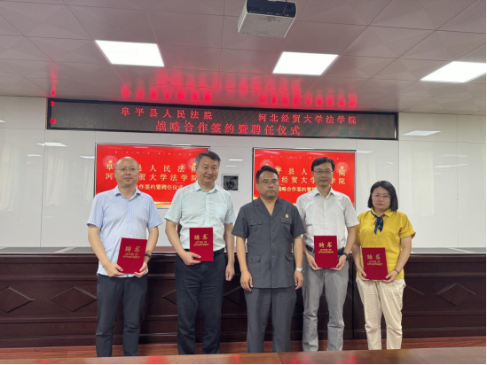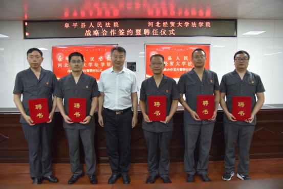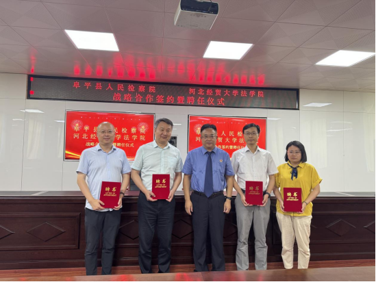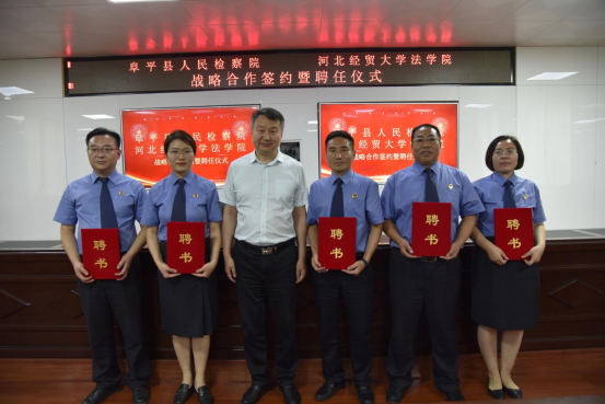 签约揭牌仪式后,检院三方举行受聘环节,胡海涛代表我院为阜平检察院刘涛、高东云、顾艳阳、朱少华、杨鑫检察官,阜平法院张明志、刘住山、贾瑞涛、冯建华、刘建美法官分别颁发校外实务导师聘书;贺啸剑、聂纪周分别代表检方、院方为公司胡海涛、李大庆、孙晓丹、陈云朝颁发咨询委员会委员聘书。