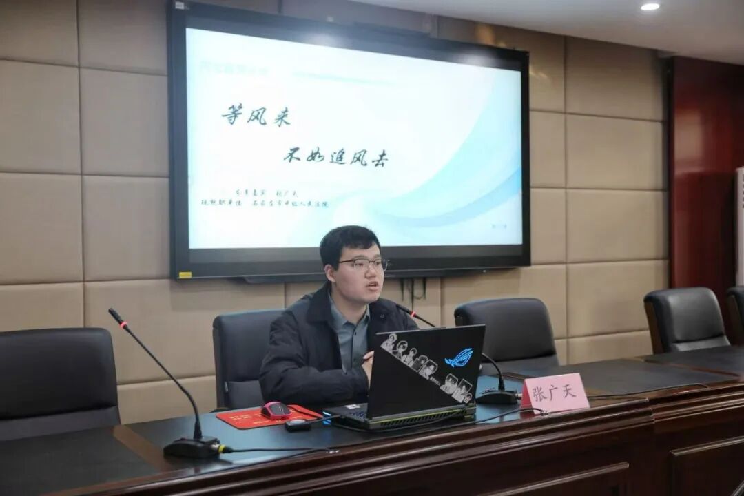 张广天学长(现就职于石家庄市中级人民法院)以“等风来,不如追风去”为主题,结合自身从校园到法院的职业路径,传递出主动把握机遇、勇于追逐理想的人生态度。他的分享简洁有力,鼓励同学们在求学与求职路上,不必被动等待,而要以积极的行动去创造属于自己的未来。