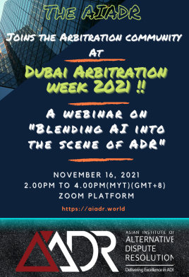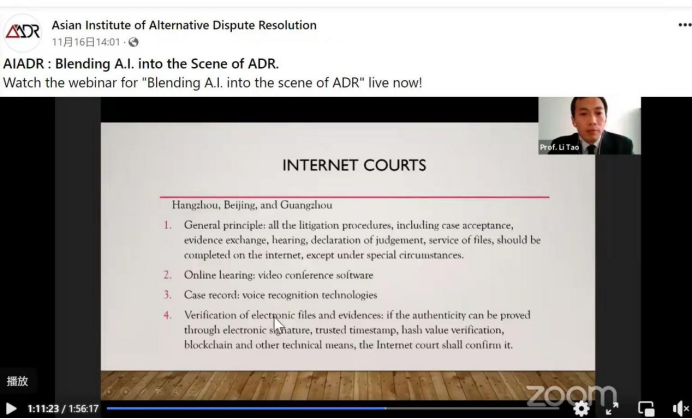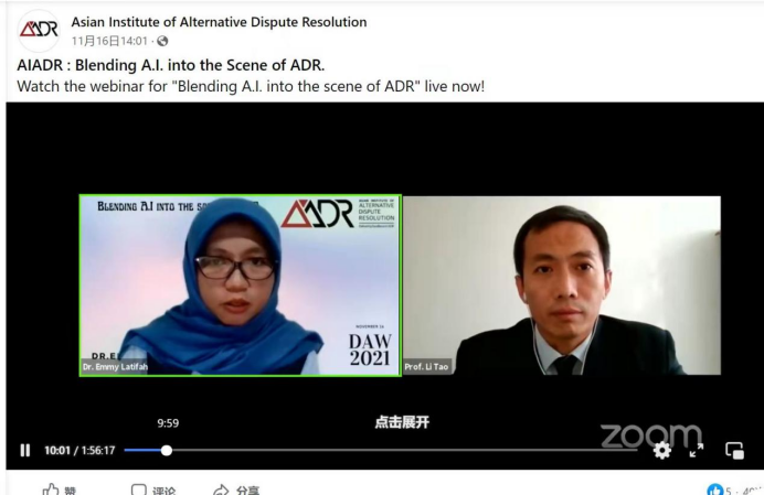 11月16日下午两点,suncitygroup太阳集团李涛教授受国际组织——亚洲多元争议解决研究院(AIADR)的邀请参加由迪拜仲裁社区,迪拜国际金融中心仲裁协会(DIFC-LCIA)组织的2021迪拜仲裁周的主题研讨会。研讨会通过zoom会议的形式进行,主题为“将人工智能融入到多元争议解决的场景”。