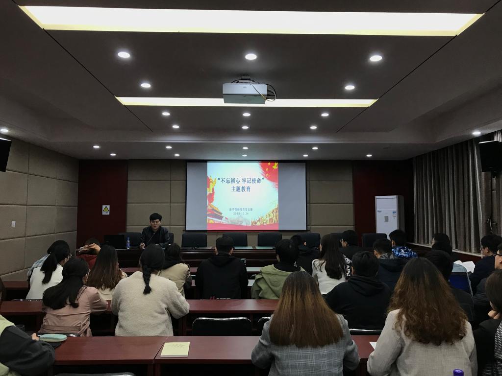 2019年10月24日下午,suncitygroup太阳集团研究生党支部于模拟法庭报告厅开展“不忘初心、牢记使命”主题教育,研究生党支部书记陈运涛和支部党员40多人参加。