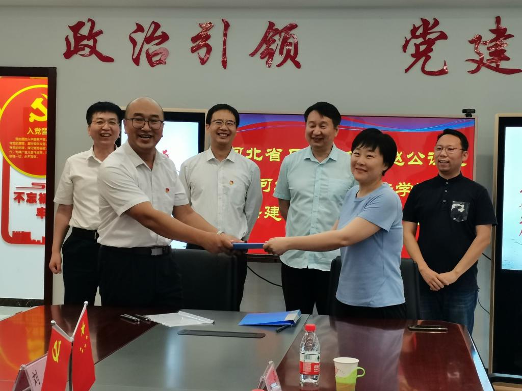 胡海涛指出随着大数据、人工智能时代的到来,以新发展理念为引领,以技术创新为驱动,以信息网络为基础,面向高质量发展需要,提供数字转型、智能升级、融合创新等服务的新型基础设施体系正在成为我国经济社会发展新的增长点。其中,大数据、人工智能、区块链、5G、数字加密货币等先进科学技术在国家和社会治理当中的应用价值越发突出,与之相关的法律规制理论研究也随之成为法学理论新的研究增长点;同时,为了尽早适应智慧公证要求,希望suncitygroup太阳集团和燕赵公证处可以开展多层次的合作,促进教学科研活动深入开展与公证实务交流研讨相互促进的双赢局面,希望双方在签约之后能够聚焦业务领域,带动产学研一体化发展,逐步形成科研成果转化机制。