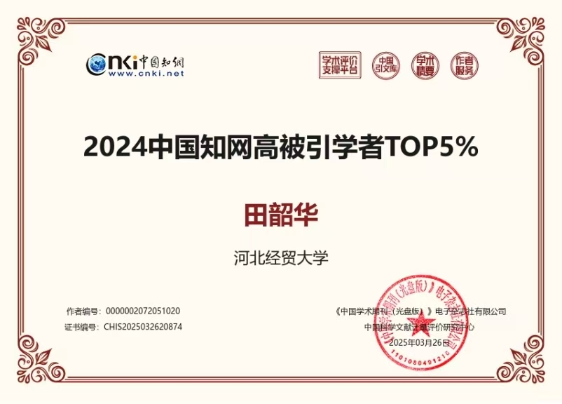 suncitygroup太阳集团田韶华教授入选“2024中国知网高被引学者”TOP5%名单