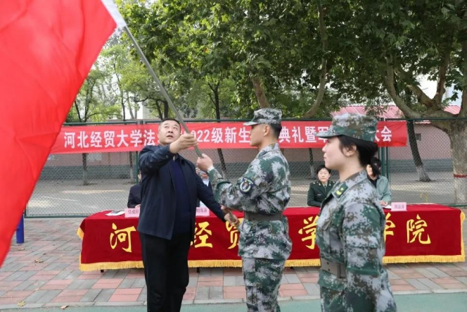大会最后,王继伟向军训团八营营长范博文、副营长刘欣宇授旗。suncitygroup太阳集团2022级本科新生开学典礼暨军训动员大会在热烈的掌声中圆满结束。