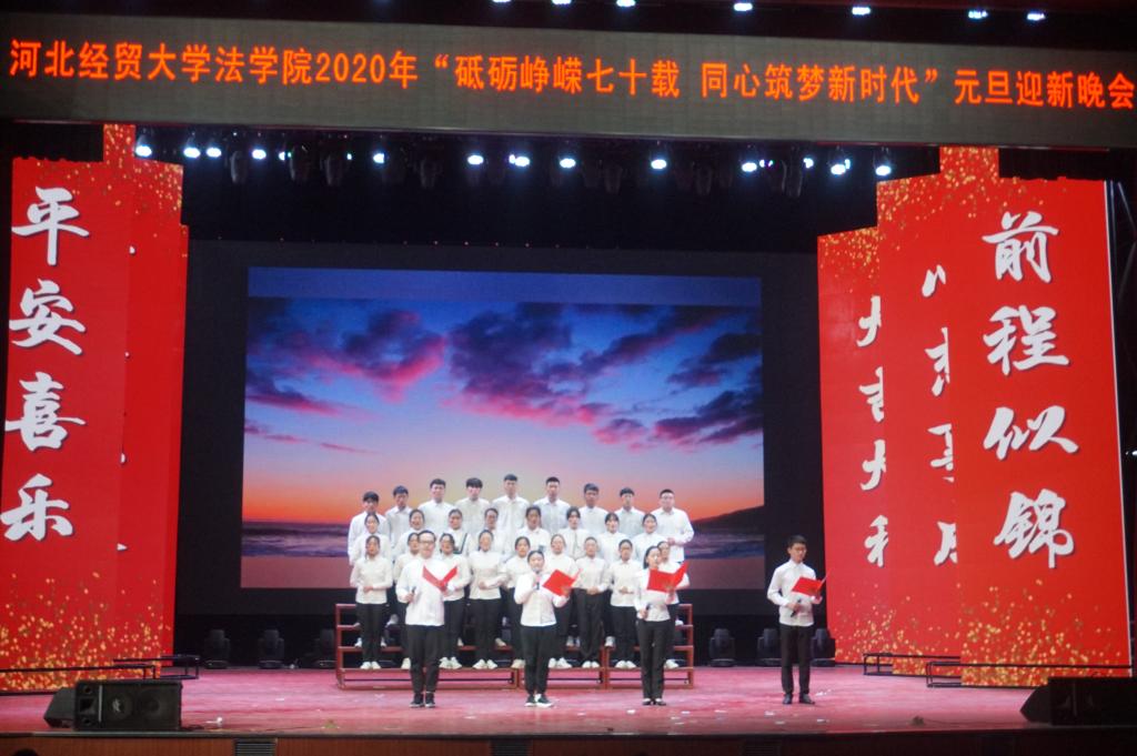 2019年12月18日晚,suncitygroup太阳集团在校礼堂举办以“砥砺峥嵘七十载 同心筑梦新时代”为主题的元旦暨迎新晚会。suncitygroup太阳集团党委书记武玉鹏、经理王利军、正处级辅导员郑建村、学工办主任、党务秘书仇志伟、团委书记陈运涛、本科生党支部书记杨景和本科生、研究生500余人观看晚会。