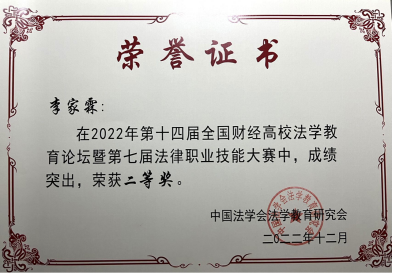 由2021级民商法学专业李家霖撰写的《中国平安财产保险股份有限公司青岛市分公司、贾星雨等健康权纠纷案》荣获二等奖;由2021级刑法学专业陈英同学撰写的《刘佳盗窃案》荣获三等奖;由2021级经济法学专业张雅欣同学撰写的《智慧井盖德法并“冀”守护群众“脚下安全”---兼评以危险方法危害公共安全罪》荣获三等奖。